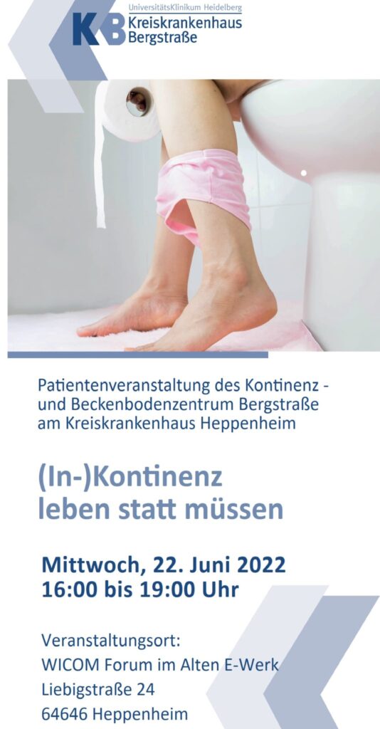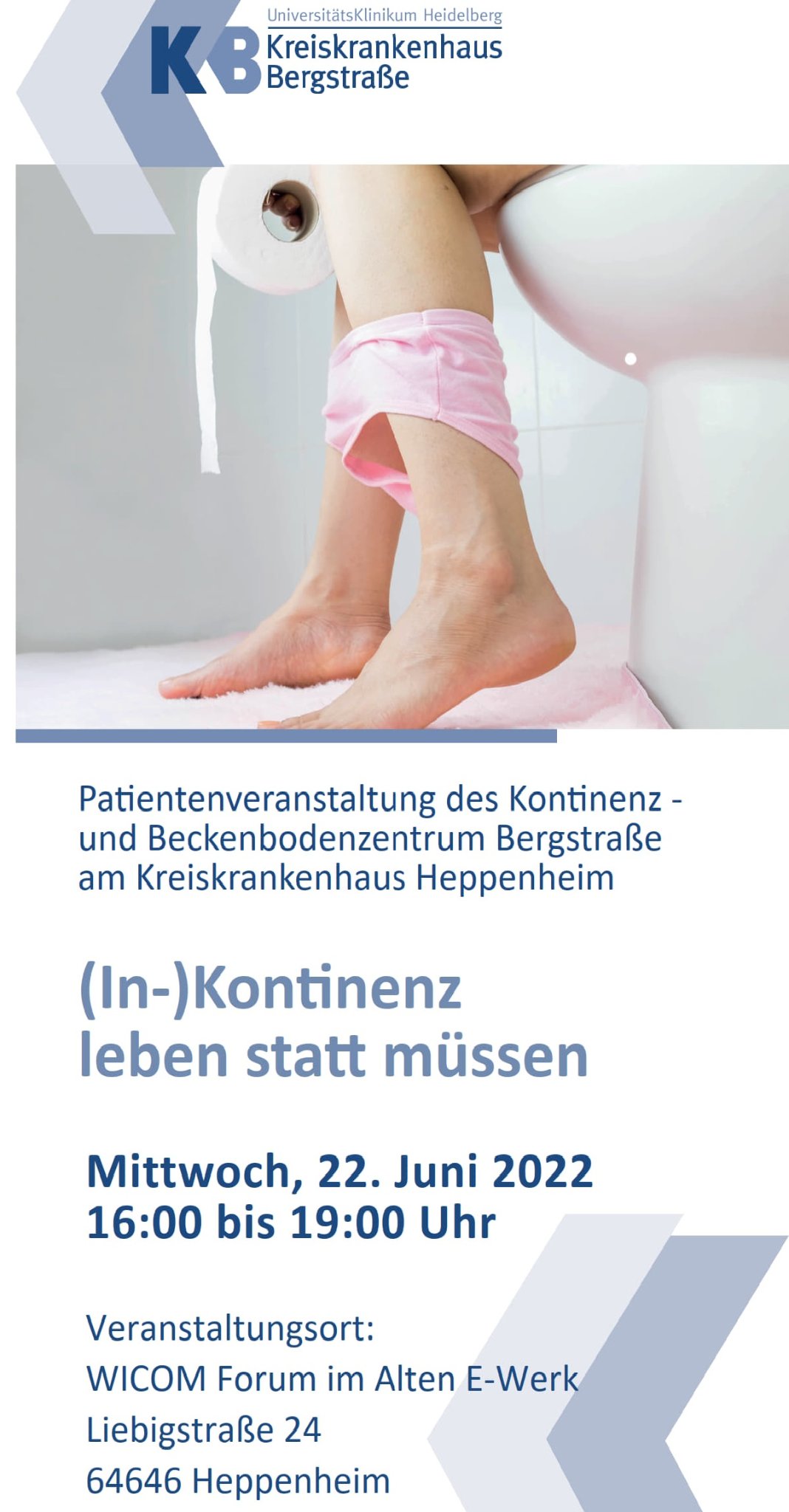 Jede(r) 10. Deutsche ist inkontinent! Jede Altersgruppe ist betroffen! Die gute Nachricht: Jede Inkontinenz kann behandelt werden. Das Kontinenzzentrum Bergstraße des Kreiskrankenhauses informiert über Therapieformen und Hilfsmittel. Alle Betroffenen und Interessierten sind zur kostenlosen Veranstaltung eingeladen. Wann?: heute, am Mittwoch (22.6.22), 16 bis 19 Uhr; Wo?: WICOM Forum im Alten E-Werk (Liebigstraße 24, HP); Motto?: (In)Kontinenz – leben statt müssen J