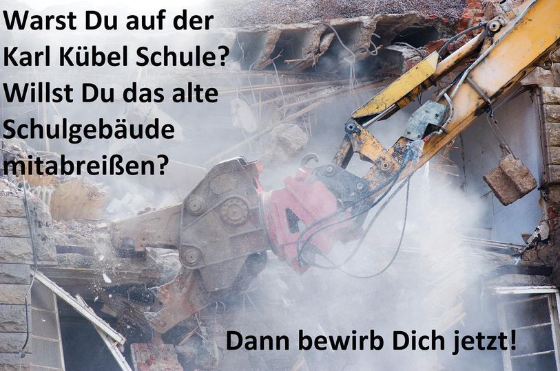 Wer hat nicht mal davon geträumt, seine Schule abzureißen? Ehemalige Karl-Kübel-Schüler und -Schülerinnen haben nun die Chance dazu: Am kommenden Dienstag (26.07.2022) starte ich um 13.30 Uhr den Abriss des alten Schul-Gebäudes. Ein Ex-Schüler/eine Ex-Schülerin der KKS kann beim Baggerbiss mitmachen. Bewerben Sie sich hier im Kommentar und schreiben Sie mir, warum gerade Sie dabei sein sollten! Wer bis Montag (25.7., 12 Uhr) die meisten likes unter seinem Kommentar erhält ist dabei!