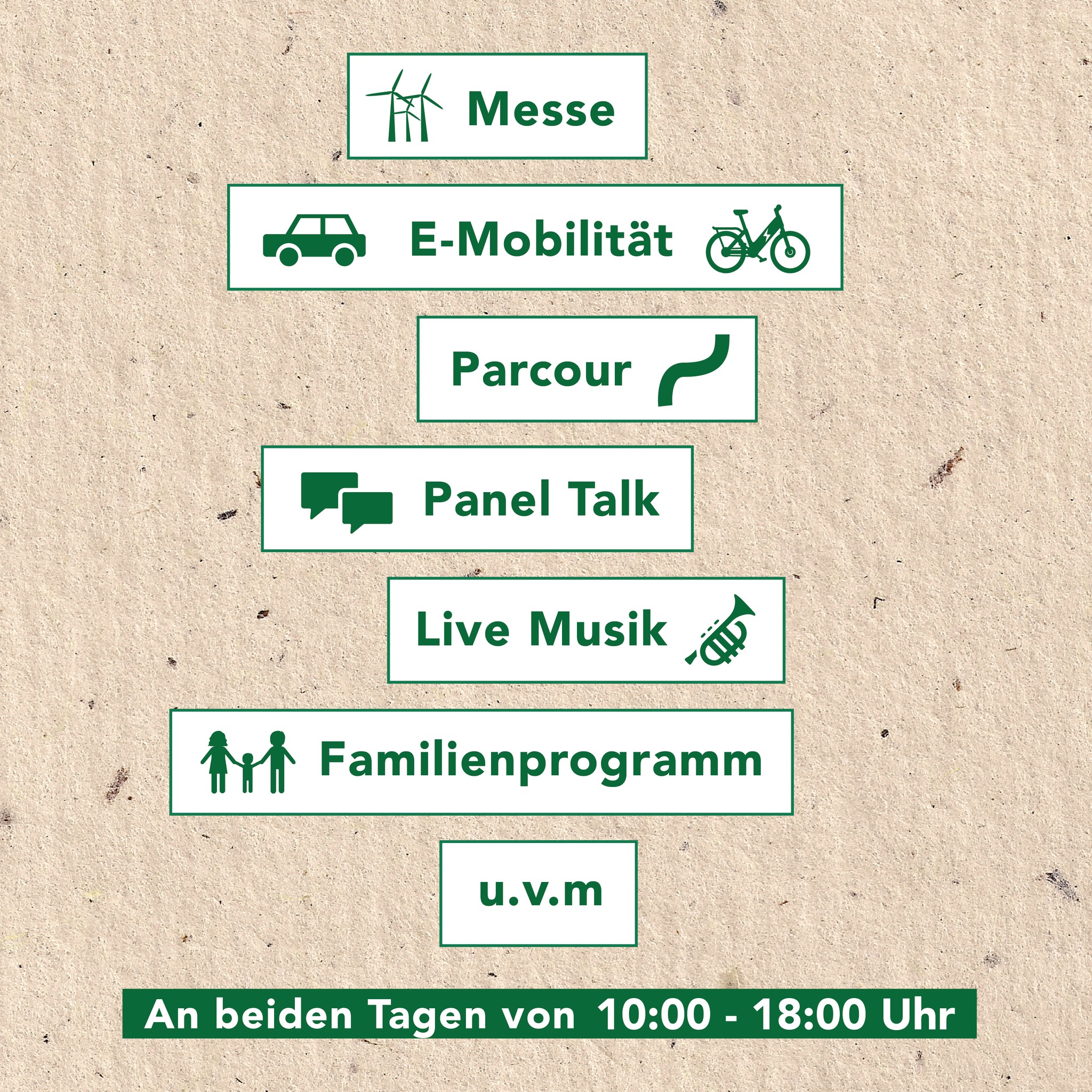 Erfahren Sie mehr über die Fokusthemen der Zukunft Energie, Mobilität, Regionalität und Wärme. Es warten inspirierende Ausstellerinnen und Aussteller auf Sie und bieten Ihnen neben spannenden Nachhaltigkeitsthemen, eine Fahrradmesse mit einem Bike-Parcours zum Ausprobieren, Autos zum Anfassen, ein buntes Familienprogramm, Live-Musik und leckeres Essen sowie Getränke.