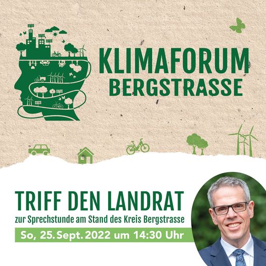 Nächste Woche Samstag (24.09.) startet das erste Klimaforum Bergstraße. Hier informieren wir Sie rund um die Themen Energie- Wärme- und Mobilitätswende sowie regionale Produkte und nehmen Sie mit in eine nachhaltigere Zukunft. Ich freue mich schon sehr auf das super Programm! Ganz besonders freue ich mich dabei auf die Landratssprechstunde, die am Sonntag, den 25.09. ab 14:30 Uhr, im Rahmen des Klimaforums in Bensheim stattfindet! Kommen Sie vorbei und sprechen Sie mit mir über das, was Sie ganz persönlich bewegt. Ich freue mich, mit Ihnen auszutauschen!