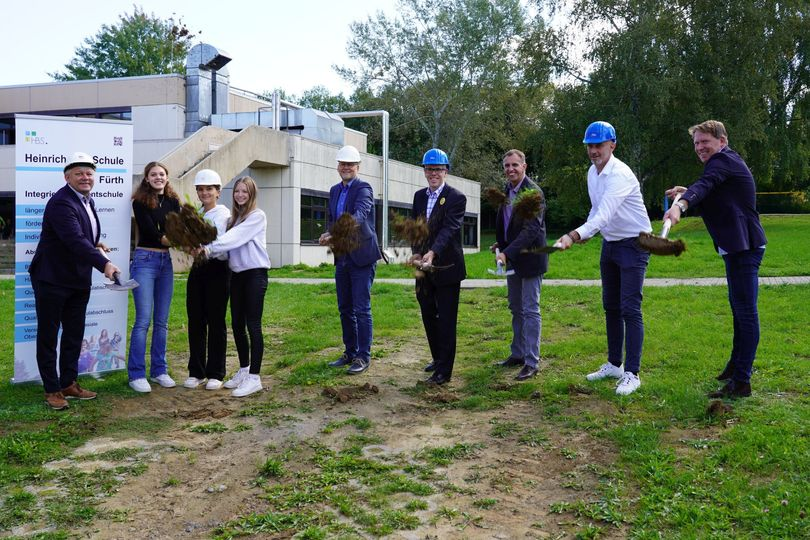 Mit dem offiziellen Spatenstich hat Landrat Christian Engelhardt (4. v. r.) gemeinsam mit (v. l. n. r.) Bürgermeister Volker Oehlenschläger, Vertreterinnen der Schulgemeinde, Schulleiter Alexander Hauptmann, Eik Burger (Eigenbetrieb Schule + Gebäudewirtschaft des Kreises), Matthias Wenderlein von der Projektgruppe Architektur + Planungsgesellschaft mbH aus Darmstadt und Boris Oberle (stellvertretender Schulleiter der HBS) den Startschuss für den Erweiterungsbau gegeben.