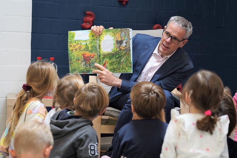 Mein zweiter Termin zum Vorlesetag hat mich heute in die katholische Kindertagesstätte St. Bartholomäus in Heppenheim geführt. Dort habe ich aus dem Bilderbuch „Mama Muh schaukelt“ vorgelesen. Darin geht es um eine Kuh, die keine Lust mehr hat, immer nur auf der Weide rumzustehen. Und viele Fragen musste ich beantworten. Zum Beispiel, wo ich als Landrat arbeite. J