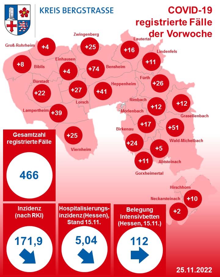In den letzten 7 Tagen hatten wir kreisweit insgesamt 466 Infektionsfälle, die neu registriert wurden (5x Abtsteinach; 74x Bensheim; 8x Biblis; 24x Birkenau; 22x Bürstadt; 4x Einhausen; 26x Fürth; 11x Gorxheimertal; 12x Grasellenbach; 4x Groß-Rohrheim; 41x Heppenheim; 10x Hirschhorn; 39x Lampertheim; 16x Lautertal; 11x Lindenfels; 27x Lorsch; 17x Mörlenbach; 2x Neckarsteinach; 12x Rimbach; 25x Viernheim; 51x Wald-Michelbach; 25x Zwingenberg).