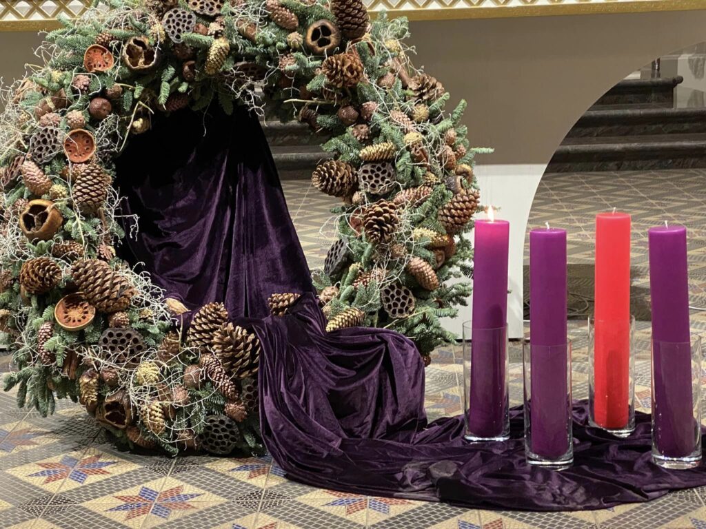 Dieser Adventskranz ist in der Kathedrale „St. Peter und Paul“ in Kaunas (Litauen). Fast direkt neben der Kirche ist der Rathausplatz, auf dem der prächtige Weihnachtsbaum der Stadt Kaunas steht.