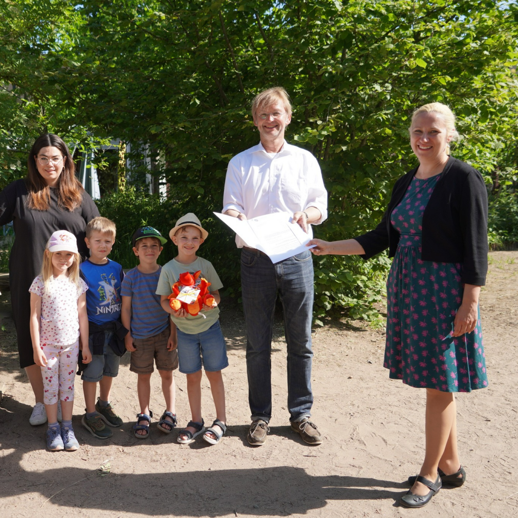 Ein großes neues Klettergerüst – das haben sich die Kinder der Evangelischen Kita in Lorsch für ihr Außengelände gewünscht. Dabei wird auch sie im Rahmen der „Kleinen Bauförderung“ des Landes Hessen unterstützt. Für die Förderung in Höhe von 17.842 Euro hat die Erste Kreisbeigeordnete und Jugenddezernentin Diana Stolz der stellvertretenden Einrichtungsleitung Lisa Virnkaes und dem Pfarrer der Evangelischen Kirche Lorsch Renatus Keller den Weiterbewilligungsbescheid überreicht. Die Planung des gewünschten Gerüstes wurde mit den Kindern gemeinsam entschieden. So soll es u.a. aus Naturprodukten angefertigt werden, und somit gut in das naturbelassene Außengelände passen. Die Drachendame „Nila“ für die Kinder durfte natürlich auch nicht fehlen!
