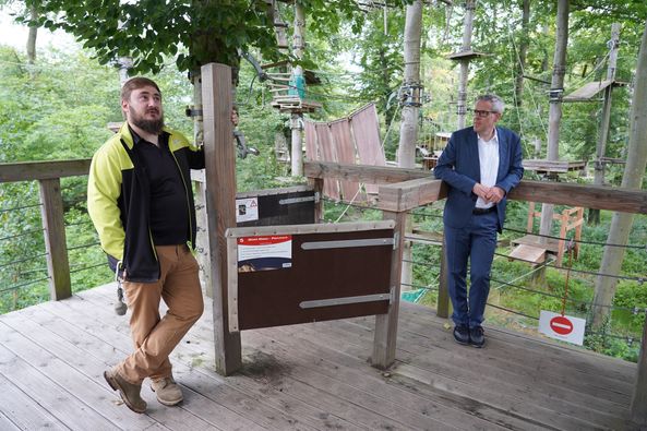 Klettern ist eine tolle Beschäftigung für Familien. Gemeinsam einen Parcours bewältigen, kann ganz schön zusammenschweißen. Im Viernheimer Kletterwald gibt es gleich zwölf Strecken – manche sind für Anfänger, andere ganz schön anspruchsvoll. Mir gefällt es, dass Kinder, Jugendliche und Erwachsene hier ihre Grenzen austesten können und trotzdem immer gut gesichert sind. Und das auch noch mitten in der Natur. Daher ist der Kletterwald ein tolles Ausflugsziel nicht nur für Bergsträßerinnen und Bergsträßer, sondern auch für Touristen, die im Kreis ihre Ferien verbringen. Außerdem ist er nach wie vor einfach eine ziemlich gute Geschäftsidee. Der Viernheimer Kletterwald war der erste der Forrest Adventures GmbH, die mittlerweile drei weitere Kletterwälder und einen Baumwipfelpfad betreibt. Auf meiner Sommertour habe ich hier sehr gerne vorbeigeschaut – und fand es dabei sehr spannend zu hören, wie der Kletterwald auf den Klimawandel reagiert.
