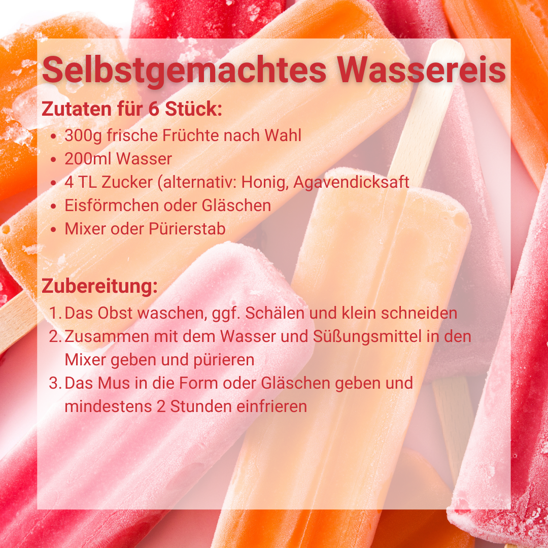 Nach dem ganzen Regen kehrt diese Woche wieder der Sommer zurück. Bis zu 30 Grad sollen es werden! Bei solchen Temperaturen bekomme ich immer Lust auf Eis. Wie passend, dass heute Wassereistag ist! Das Tolle: Man kann Wassereis auch ganz leicht selbst machen. Deswegen hier ein Rezept zur Inspiration!