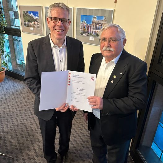 Die Stärke eines Landes wird geprägt durch das gesellschaftliche Klima und die Art, wie wir miteinander umgehen. Das merken wir vor allem in der aktuellen Zeit, die leider von Krisen geprägt ist. Die Aussage erinnert aber auch daran, dass jeder Einzelne von uns die Kraft hat, einen positiven Wandel in der Gesellschaft zu bewirken. Ein leuchtendes Beispiel hierfür ist Bernhard Wahlig, dem ich heute gemeinsam mit der Bensheimer Bürgermeisterin Christine Klein den Landesehrenbrief für sein langjähriges und vorbildliches Ehrenamt überreichen durfte!