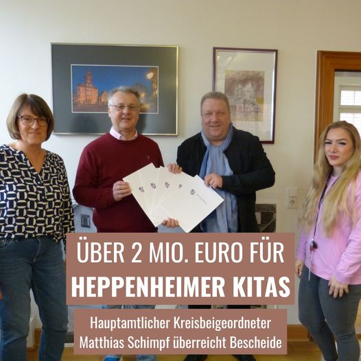 Im Rahmen des Landesinvestitionsprogramms „Kinderbetreuung 2020-2024“ erhalten 5 Kitas in Heppenheim Fördermittel in Höhe von insg. über 2 Mio. Euro. Die Weiterbewilligungsbescheide dafür konnte kürzlich der hauptamtliche Kreisbeigeordnete Matthias Schimpf der Stadt Heppenheim überreichen.