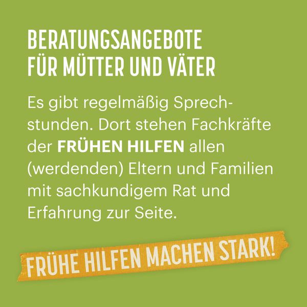 Kennen Sie schon unsere Frühen Hilfen? Sie sind ein niedrigschwelliges Bildungs-, Beratungs- und Unterstützungsangebot für (werdende) Eltern. Im Mittelpunkt stehen dabei alle Fragen rund um Schwangerschaft, Geburt und die ersten 3 Lebensjahre des Kindes.