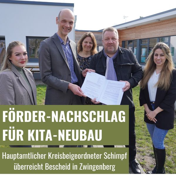 Im Jahr 2021 wurde die Kindertagesstätte „Tagweide“ für Kinder im Alter von einem bis sechs Jahre in Zwingenberg eröffnet. Knapp 500.000 Euro Fördergelder hatte die Gemeinde für den Neubau vom Land Hessen bereits bekommen. Nun brachte der hauptamtliche Kreisbeigeordnete Matthias Schimpf noch einen Nachschlag in Form eines Bescheides über 31.967 Euro vorbei. Möglich wurde das, weil das dem Kreis Bergstraße vom Land Hessen zur Verfügung gestellte Budget vollständig ausgeschöpft worden war und so weitere Mittel aus dem Investitionsprogramm „Kinderbetreuung 2020 bis 2024“ an den Kreis umverteilt wurden.