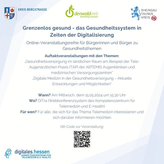 Den Auftakt machen am 15. Mai um 15.30 Uhr die zwei Vorträge „Digitale Medizin in der Gesundheitsversorgung – Aktuelle Entwicklungen und Möglichkeiten“ und „Gesundheitsversorgung im ländlichen Raum am Beispiel der Tele-Augenärztlichen Praxis (TAP) der ARTEMIS Augenkliniken und medizinischen Versorgungszentren“. Anmeldung unter https://www.ehealth-zentrum.de/grenzenlos-gesund oder über den QR-Code im Bild.